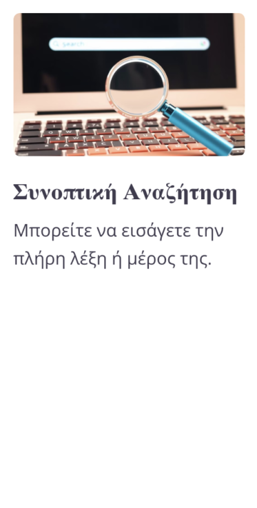 Για να βρείτε μια λέξη, απλά εισάγετέ την στη γραμμή αναζήτησης. Κατά την πληκτρολόγηση, θα εμφανιστούν προτεινόμενα λήμματα με βάση την καταχώρησή σας.